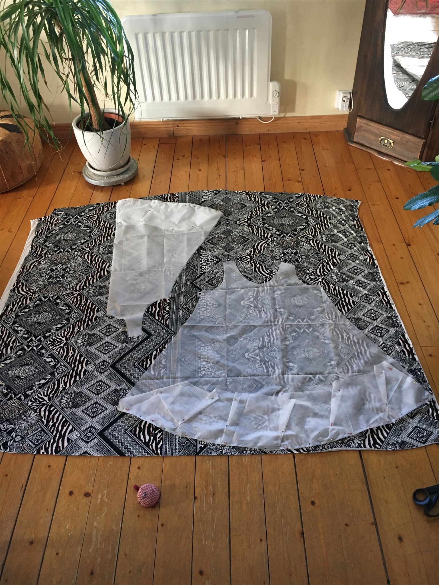 Tyget är utlagt på enkel bredd eftersom jag själv ville bestämma hur mönstret ska se ut på framsidan. Den smala biten mönster är ryggdelen och den ska läggas ut en gång till på tyget och sen syr man ihop de båda ryggdelarna med en söm.