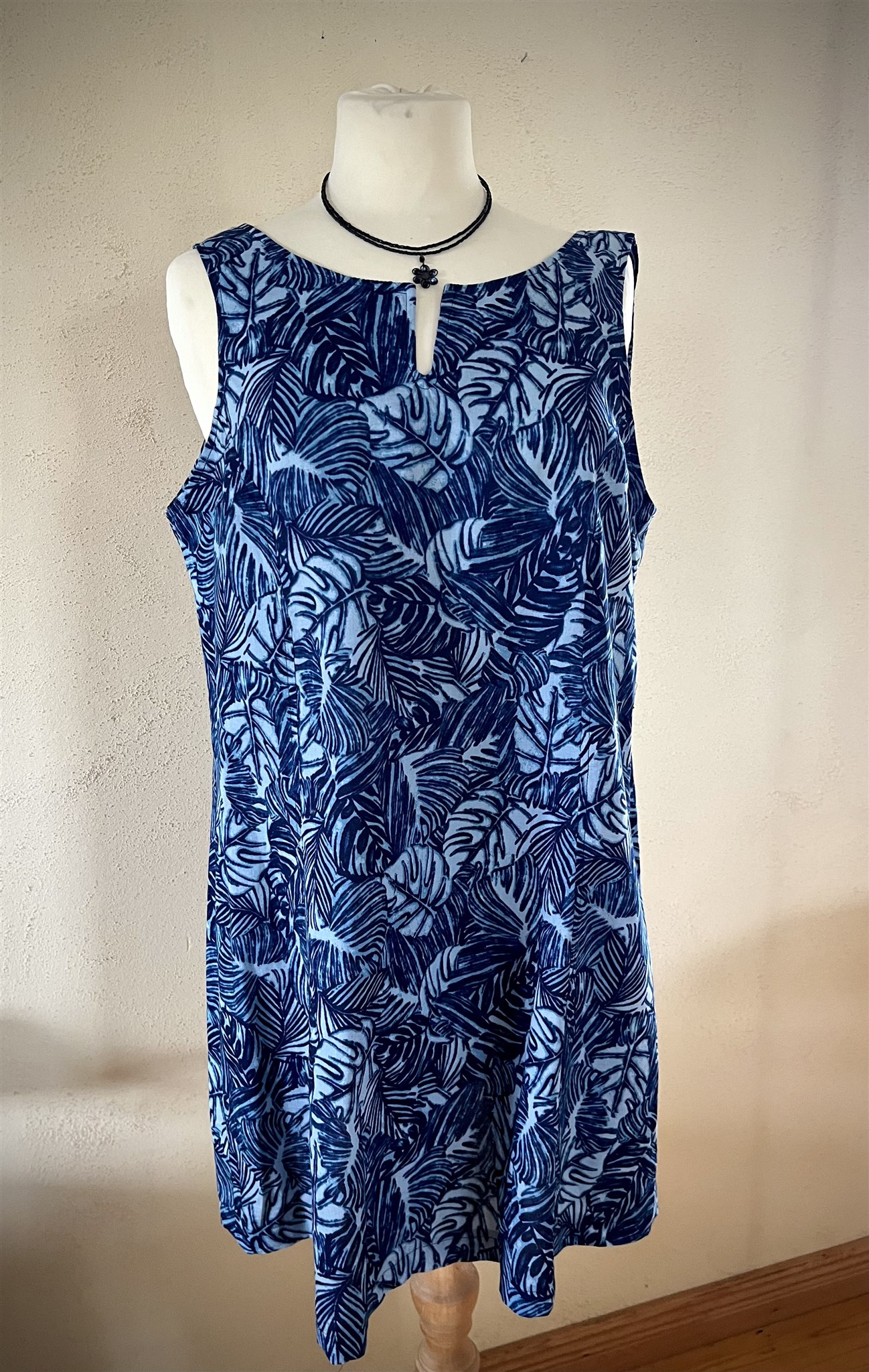 Det här tyget köpte jag på nån symässa för nåt år sedan. Nu har det blivit en enkel sommarklänning med bronsknappar som dekoration vid ärmslutet och sprunden på sidorna.