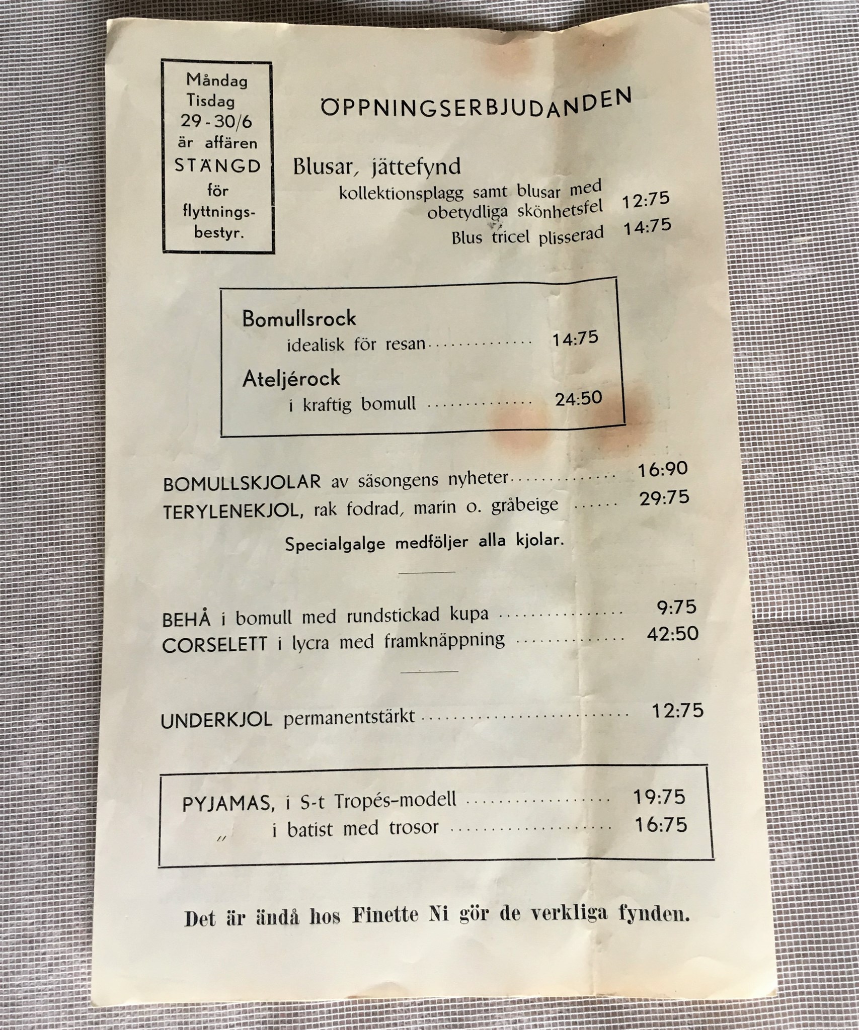 En liten broschyr från Finette som tydligen var en damklädesaffär i Stockholm.