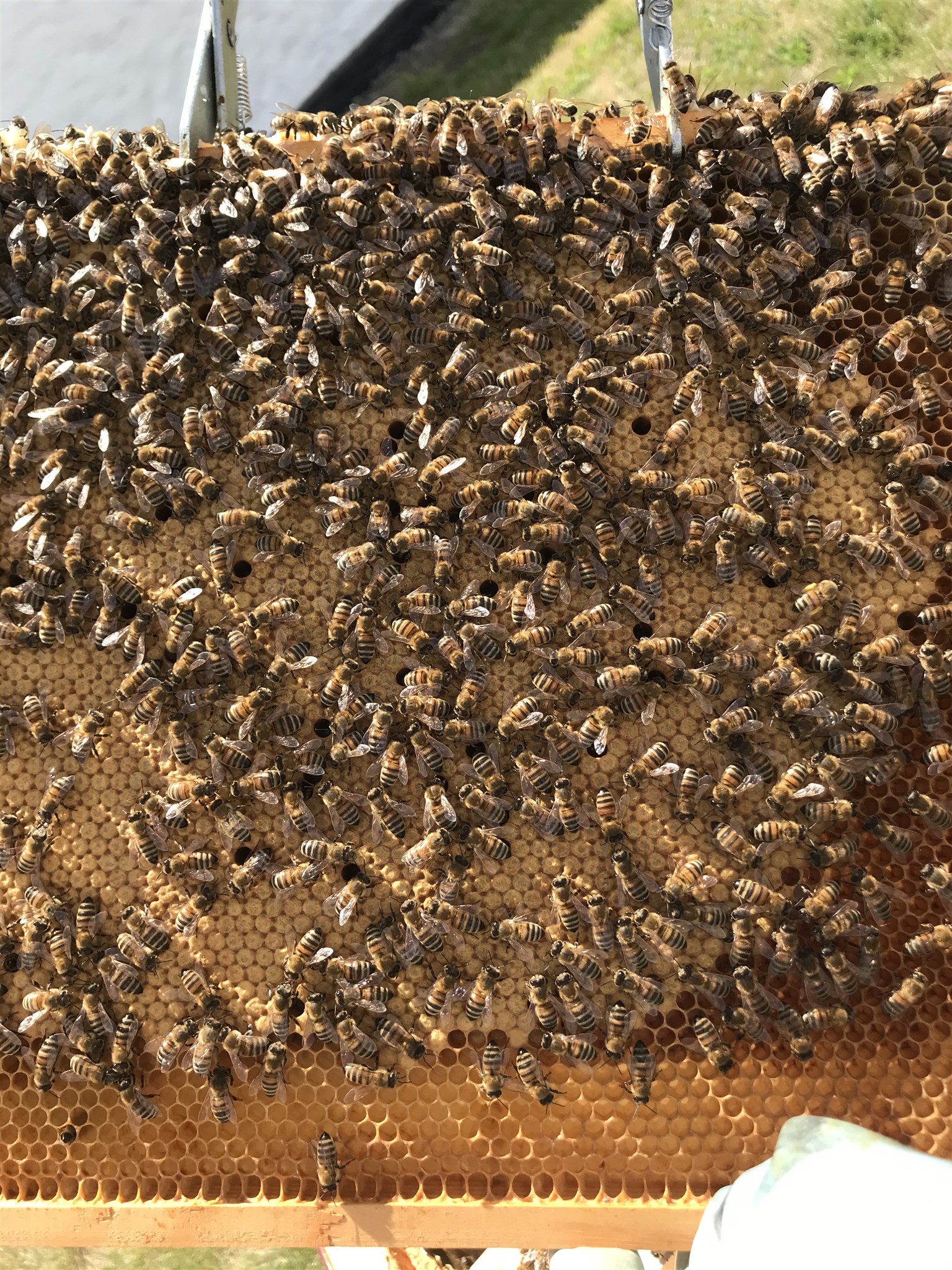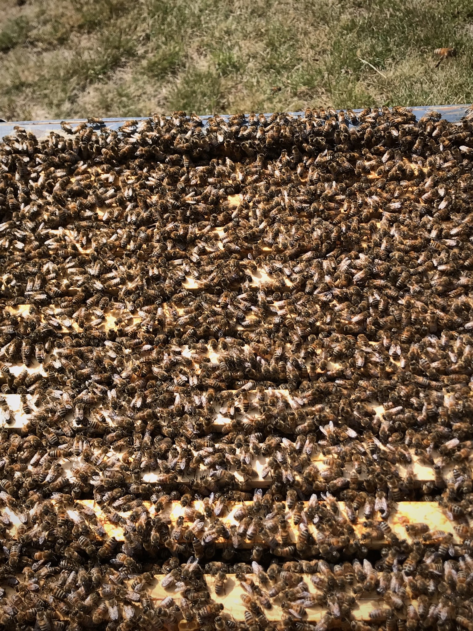 Ni ser att drottningen är mycket större än bina och att hon är klippt i den vänstra vingen. Hon är också märkt med en gul prick (år 2017) vilket innebär att hon var två år gammal. Hon skulle bytas ut i år oavsett men det hade varit bättre om jag själv hade fått byta henne.