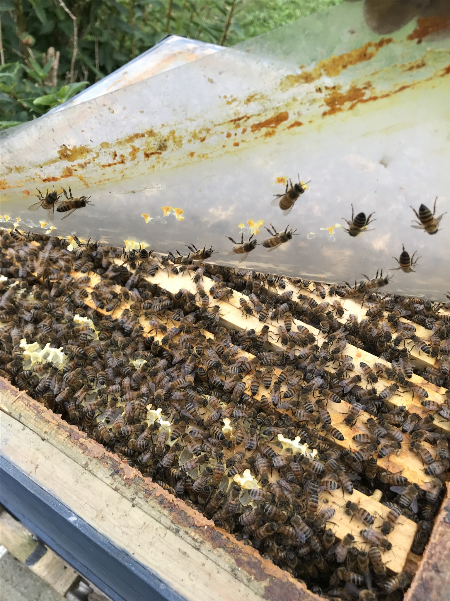 Bilden ovan är tagen genom plasten och de gula klumparna är vax som bina byggt.