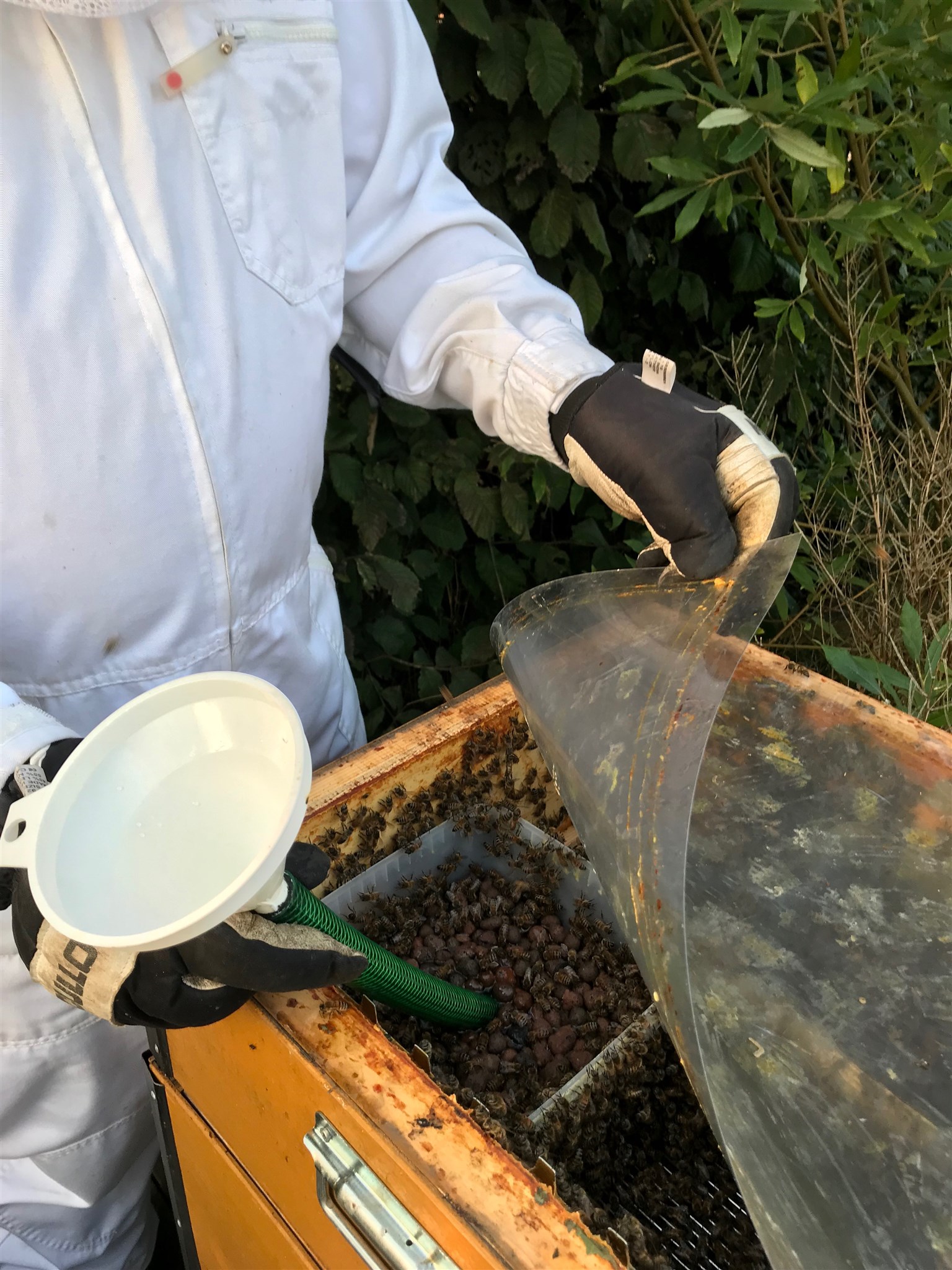 Eftersom vi tagit all honung från bina måste vi direkt ge dem ny mat och det blev en sockerlösning på 50%