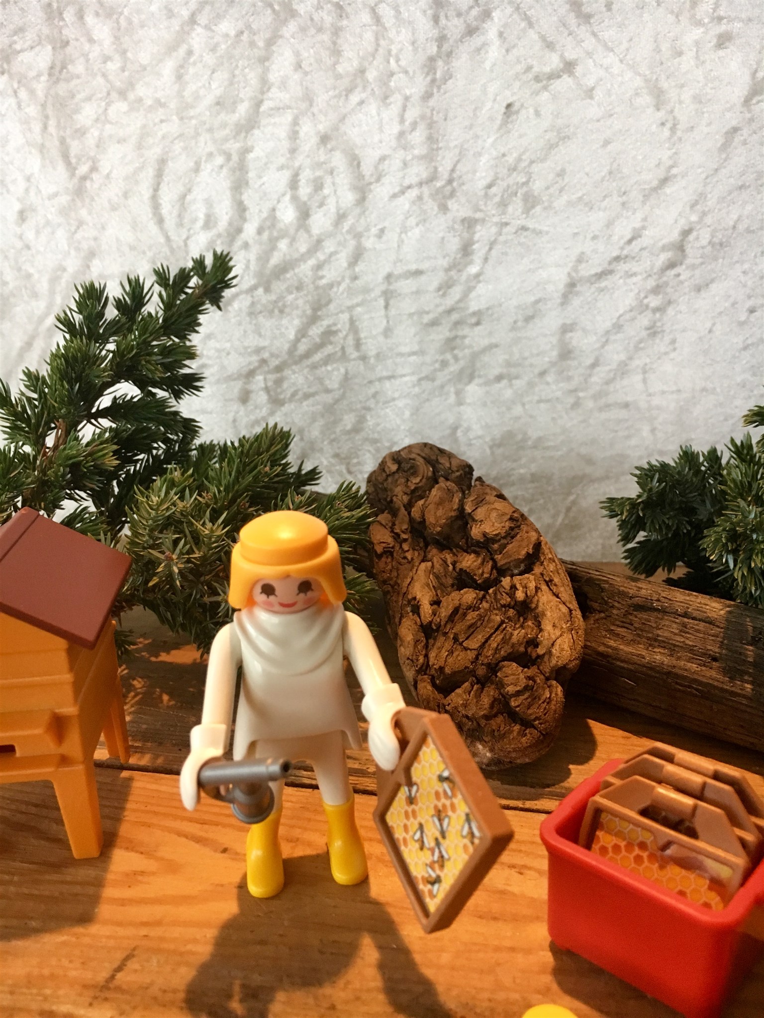 Allt finns med...rökpust, handskar, bidräkt, kupa, honungsburkar och ramar med bi.