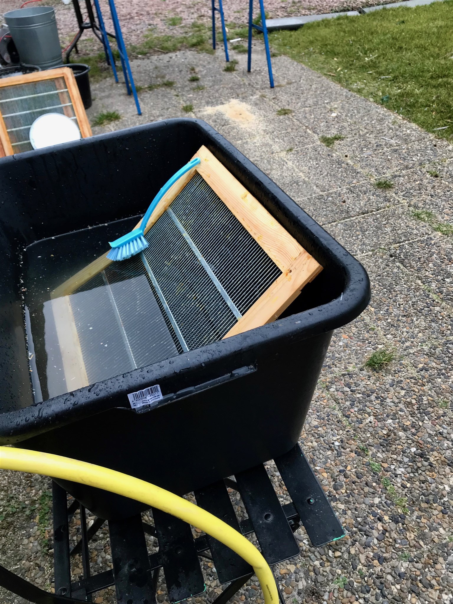 Ramar och lister doppar jag i en stor balja där jag blandat Virkon och vatten. Ramar och andra kupdelar rengöres med en trasa.