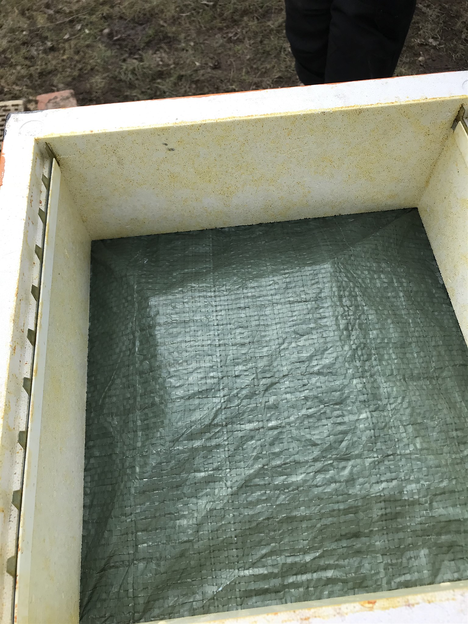 Direkt över matpaketen ligger ett linnetyg som täcker hela maten och resten av ramarna. Över detta lägger vi en tillklippt pressening som sluter helt tätt och sen en skattlåda över som håller både linnetyg och pressening på plats.