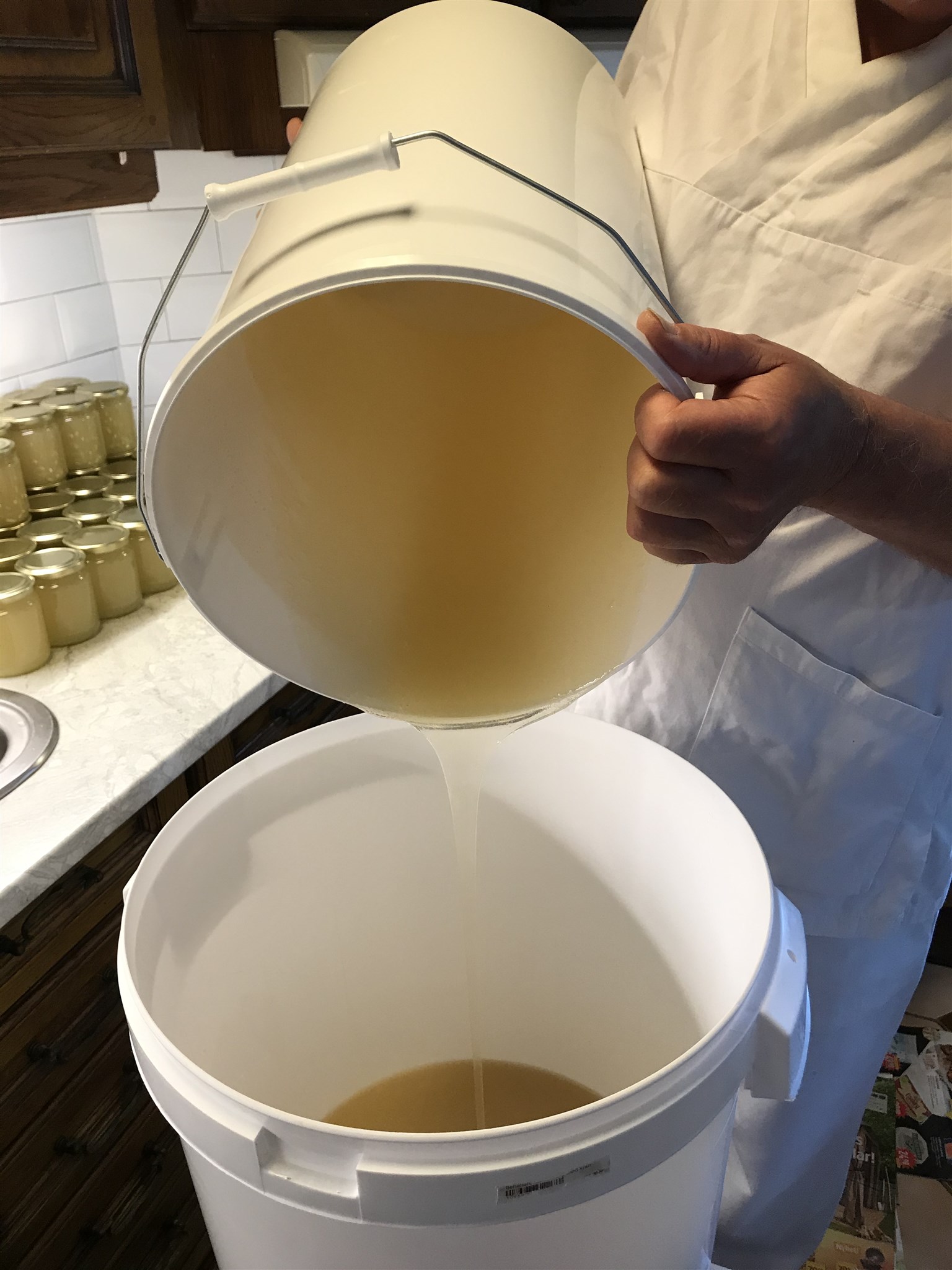 När vi slungat och honungen stått i hinkar i ett dygn är det dax att hälla på burk.